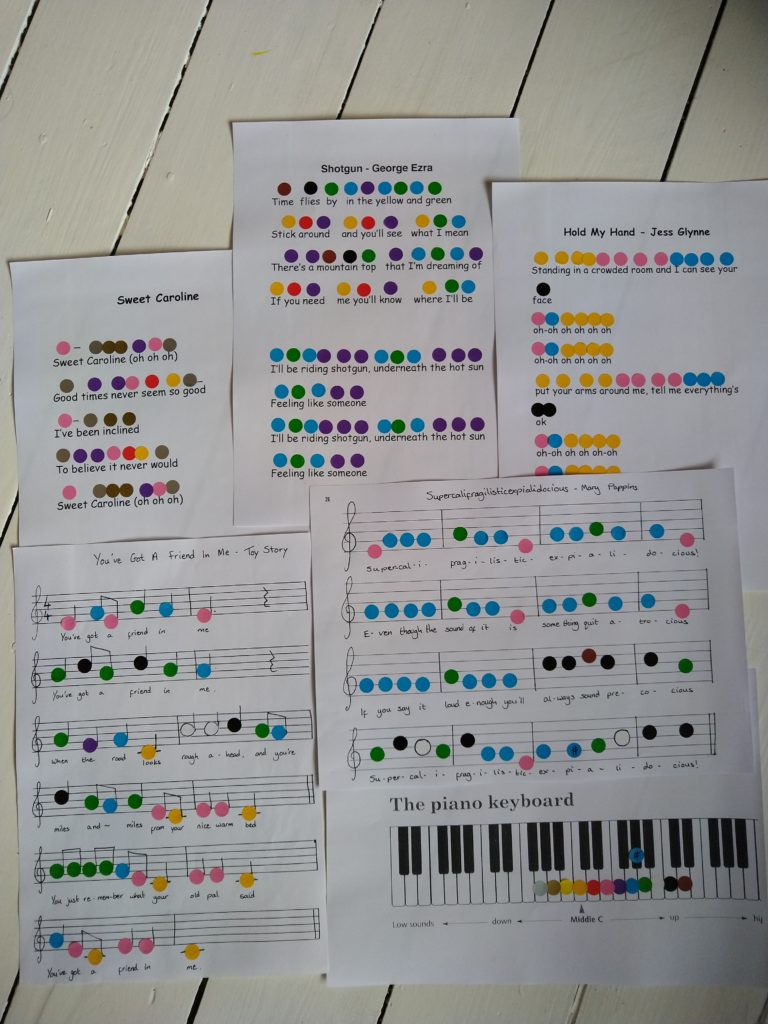 My 5 year old loves messing around on the piano and trying to play tunes he likes. So, I’ve been making these colour-coded sheets of his favourite tunes for him to play (avoiding the boring nursery rhymes!). Each coloured sticker corresponds to a note on the piano, so it’s easy for him to work out what to play on his own, without having to know note names and position on the stave. All it requires is some small pieces of coloured paper to put on the actual piano keys so he can match what’s on the music, to which key to play on the piano. If you have a young child who is showing an interest in playing the piano, but is perhaps still a bit young for formal lessons, then using colours is a really great way of helping them to navigate the keyboard and “read” music.