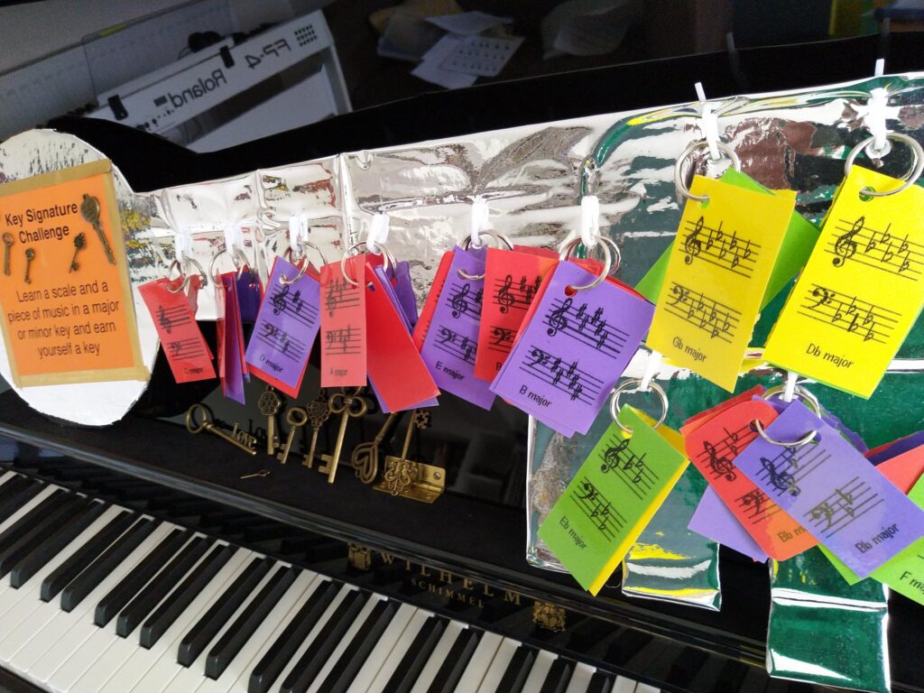 I’m a bit of a scale nerd, but not everyone is! I mean, they’re really not that fun to learn. So, in my music room, every key signature learnt and played as a scale or in a piece earns a key ring with the key signature on it, and an awesome little key. Ultimately, learning keys opens doors to playing a broader range of music