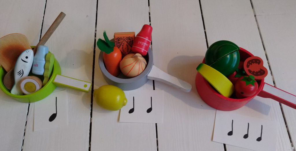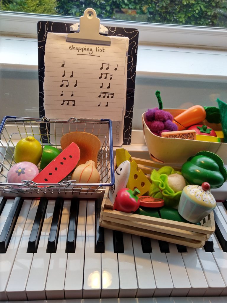 The linguist in me LOVES using words and phrases to help build knowledge and understanding of rhythm in music. And of course, it’s got to be fun! As a food-based example, a basic “Crotchet Soup” helps to identify the number of beats (or syllables) in a word and involves collecting the things with the right number of beats together to fill a pot. A “Rhythm Shopping List” requires a student to choose the items whose rhythm (when spoken out loud) matches the rhythms written down on the shopping list (which can be as easy or as difficult as necessary).