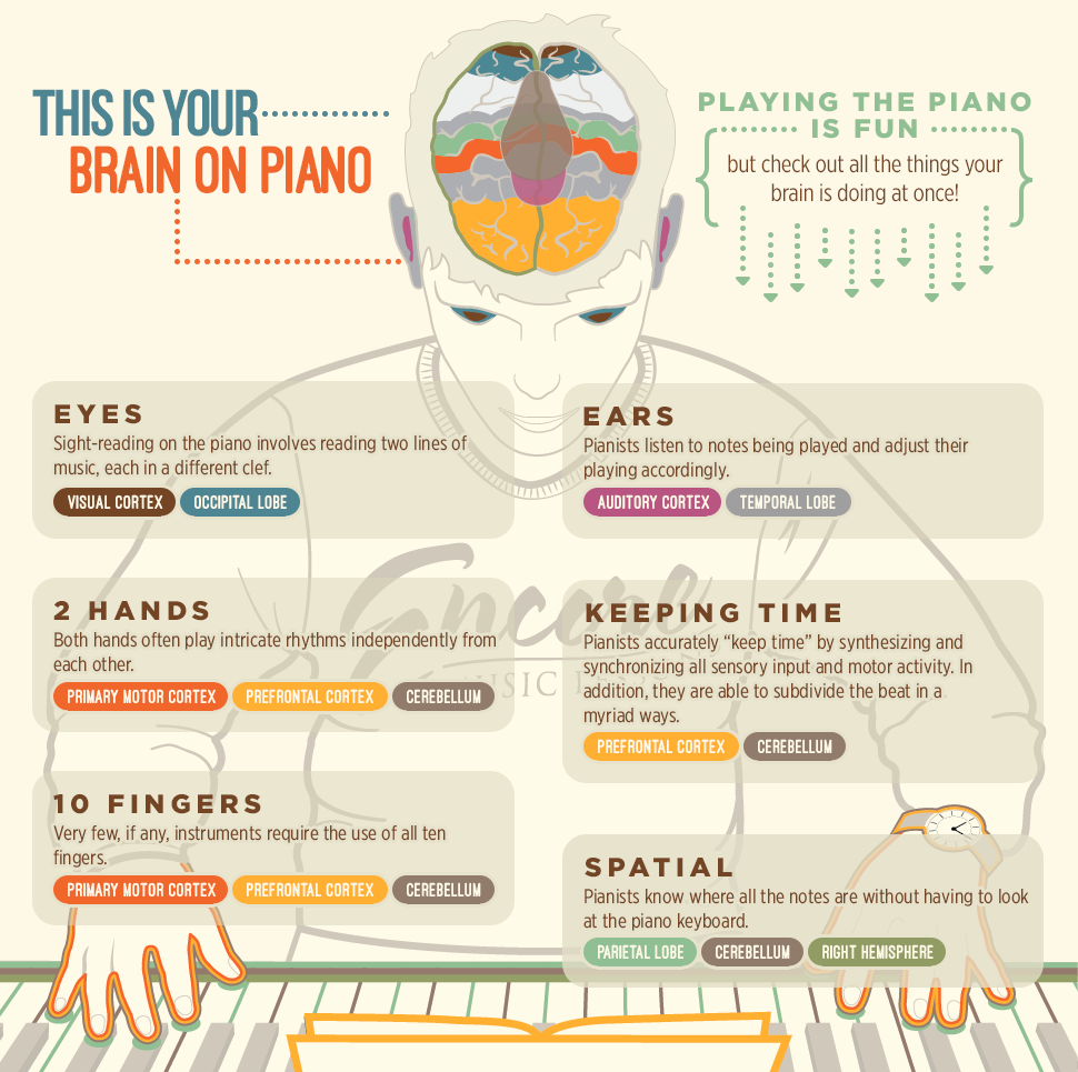 Great for playing the piano, but how does all this benefit us away from piano playing? Well, all that split concentration stimulates and exercises various parts of the brain, (check out the image below from www.pianu.com), most significantly the prefrontal cortex which plays a major role in decision-making, problem-solving and social behaviour. It also means that piano players are seriously good multitask-ers. Our brains can concentrate on several things at once, we can deal with distractions and interruptions, it enables us to cope when there is chaos going on around us.