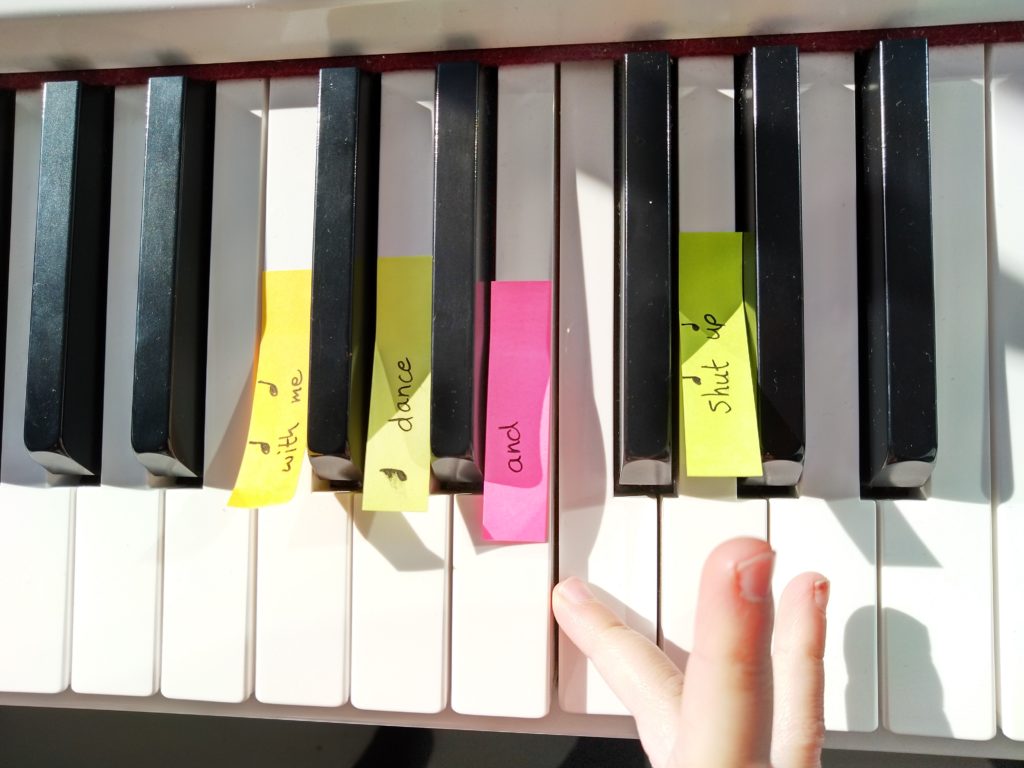I never make students learn something they don’t want to, and my lessons are very student-led. This early beginner wanted to learn to play Shut Up And Dance With Me (by Walk The Moon) ? so we figured out a way of playing the right notes on the keyboard by using sticky-notes with the lyrics on. Then we had a go at writing the notes onto some manuscript paper so she could take it home to practise. The result was a very engaged learner and a funky little duet to play for mum when she came to pick up. ? And look at those little fingers stretching to the keys ??